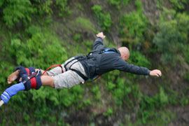 Known as bungee jumping, willing participants attach a special cord to their ankles and after a fair amount of persuasion and at least 2 or 3 "no, I cant do it" remarks, they throw themselves into thin air and hurtle down to the ground below. Just in time, the stretchy bungee cord pulls tight and the jump is complete.