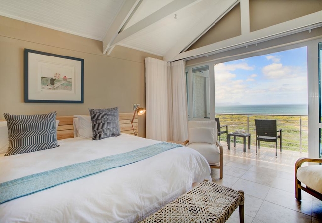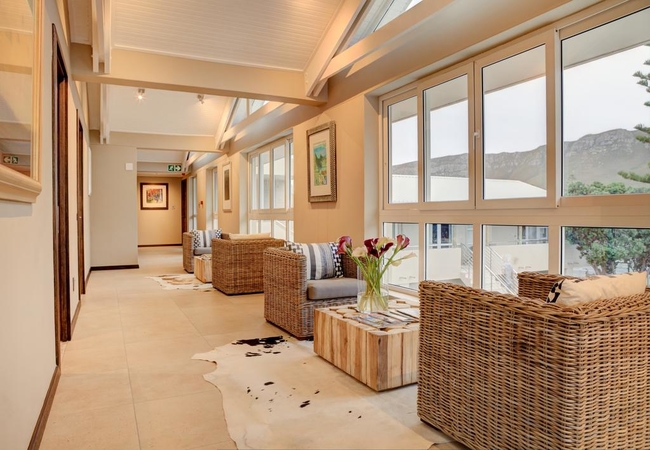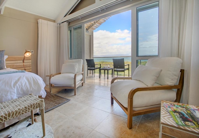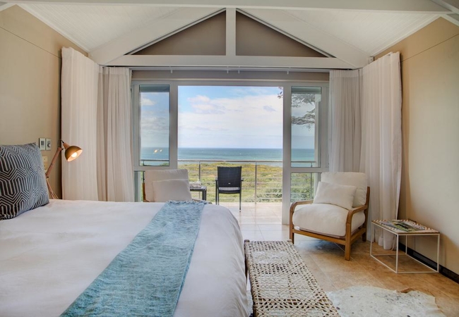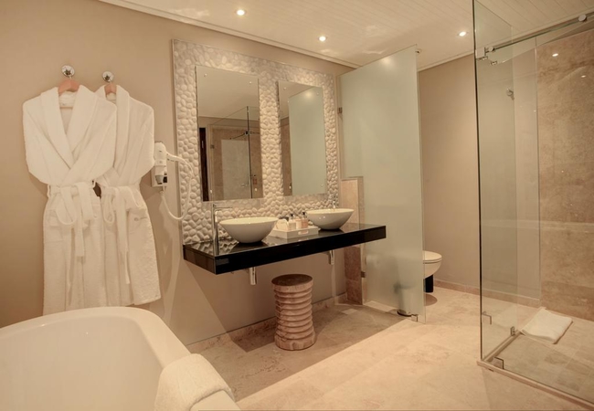 Sea facing room with intimate lounge and balcony. Spacious en-suite rooms with balconies offering panoramic views of the surrounding mountains and ocean. Individually and tastefully decorated featuring South African art and décor. Bathrooms are spacious with Basins, Baths and separate showers complimented with luxury amenities