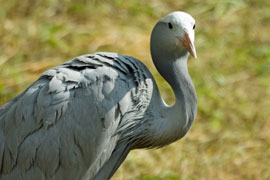 One of the smaller crane species, the Blue Crane's plumage is silvery bluish gray becoming darker on the upper neck and the lower half of the head and nape.
