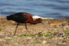 A wading bird in the Ibis family, the Glossy Ibis is a small, slender ibis with a long curved bill. It is the most widespread of the ibis species and known for its distinctive glossy metallic sheen. Adult Glossy Ibises have the head, neck, back and underparts a rich chestnut-brown. The wings are black with a metallic green sheen on the 'shoulders'.