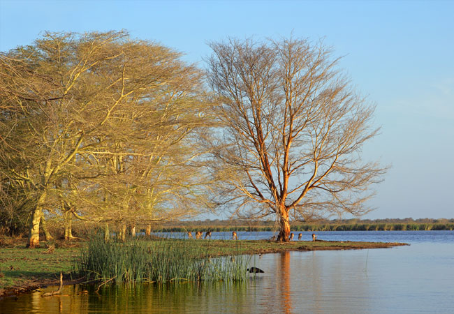 The Mkuze River curves along the reserve's northern and eastern borders with a fine stretch of fig forest along its banks. Fish Eagles swoop over the pans, snatching prey spotted from their perches in the fever trees.