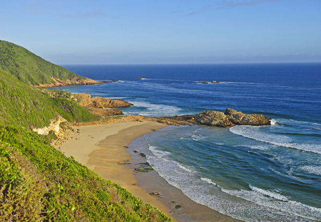 Mountains crowd close to a shoreline dotted with beaches and bays, and vividly coloured wild flowers delight the eye. Between Heidelberg and Storms River, the Garden Route runs parallel to a coastline featuring lakes, mountains, tall indigenous forests, amber -coloured rivers and golden beaches.
