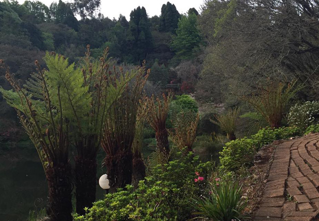The gardens include at their heart a sequence of dams, their banks lined with huge African tree ferns and quintessentially English garden features, like elms, pin oaks and crab apple trees. In spring the hydrangeas, camellias, irises and floxgloves are at their peak, and the array of colour is a rash of pinks, mauves, orange and scarlet.