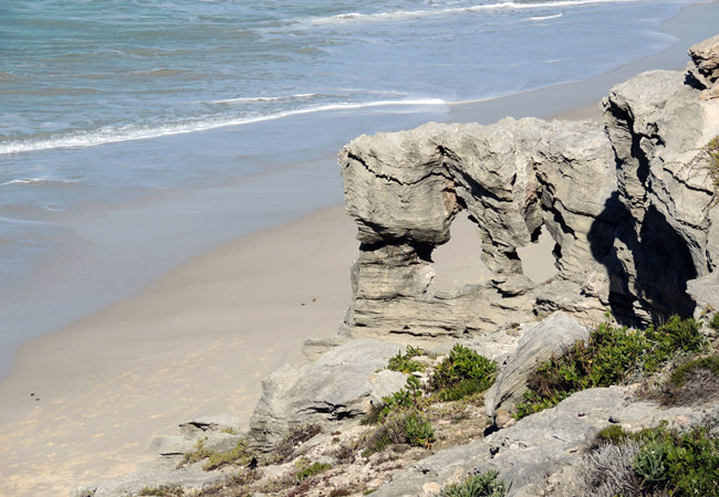 Artists and photographers in particular are attracted to Arniston because of its picturesque prettiness, and whilst the cliffs may be dangerous, the rolling sand dunes, golden beaches and intense blue of the sea make Arniston one of the best-kept secrets along the Overberg coast. The coastline is an invitation to long walks and has many examples of spectacular sea erosion with numerous displays of caverns and arches. The coastline is peppered with examples of prehistoric fish traps of the Khoisan strandlopers (beach walkers) who submerged these stone-built enclosures at high tide in a bid to catch fish. Piles of fish bones and shells are all that remain of this vanished people.