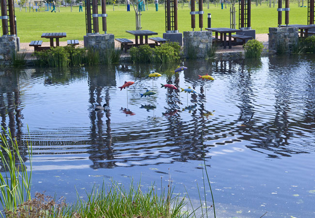 The Biodiversity park is 12.5 hectares featuring a large circular lawn area, known as the commmon, where there are cycle and running paths, play parks, and a small amphitheatre.