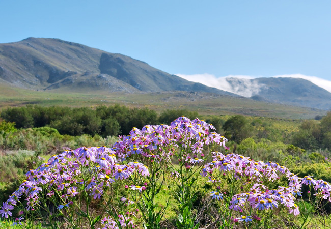 Within the nearby Fernkloof Nature Reserve, there are approximately 50km of well maintained trails through the fynbos that covers the hills and mountains that encircle the town, offering visitors the opportunity to view the unique Cape Floral Kingdom's many beautiful species up close. Close to 1500 different floral species have already been identified in this reserve, and it offers one of the most dense and diverse examples fynbos, unique to the Western Cape.