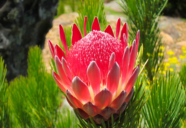 Protea garden features members of the protea family (Proteaceae). This part of the Garden is most magnificent in winter and spring, when the proteas, conebushes and serrurias are in flower. Pincushions provide a colourful display in early summer.