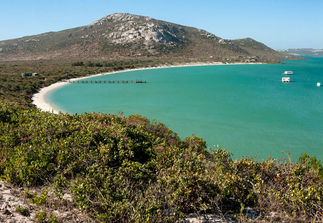 There are two well-known landmarks that make Kraalbaai so recognisable. One is the wooden jetty that seems to jut out of the centre of the white, sandy beach towards the boats moored offshore. The other is the Preekstoel or preacher's pulpit, which looks more like a modern day cycling helmet to be honest, but nonetheless provides shelter from the south-easterlies that can sweep through here.