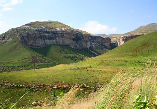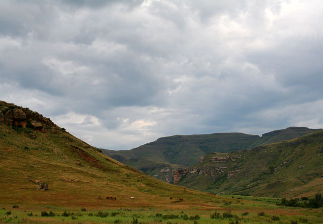 Rugged, steep krantzes silhouetted against the skyline, mountain slopes snugly covered with a grass blanket, deep lushly vegetated kloofs and a c...