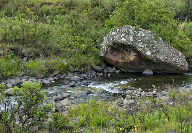 In a quiet corner of the uKhahlamba-Drakensberg World Heritage Park, with the cascading Umzimkulu river bounding one side and blue mountain sky t...