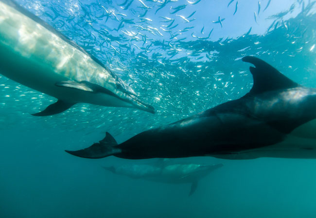 While there are in excess of 800 dolphins that skirt the coastline on a regular basis, this number rockets up to about 15 000 during the sardine run that takes place every year in July and August. Onlookers often delight in their antics and playfulness while they hunt sardines just metres off the coastline.