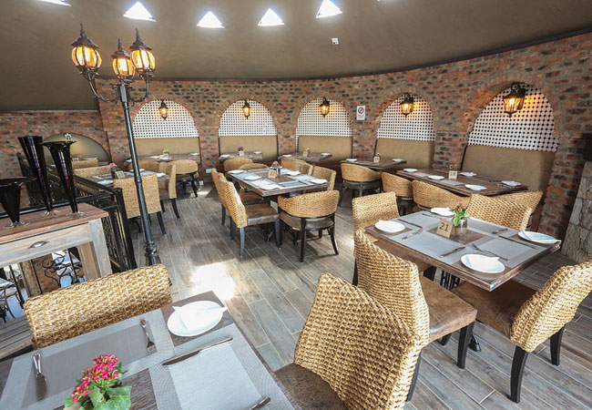 The restaurant is a double-storey space that is characterised by timeless elegance in the form of leather-finished loungers, a dramatic cast-iron staircase and a beautiful combination of wicker and stone. Intimate booths nestle beneath deep arches in domed walls for a romantic and unique dining experience. Lunches in the sun room, dinners at the fireplace, and a relaxing drink on the terrace all afford breath-taking views and a languorous, indulgent approach to South African cuisine.