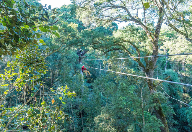 This nature conservation protects over 116 varieties of giant trees including the Outeniqua Yellowwood, Stink Wood, Iron Wood, Hard Pear, Candle Wood as well as all the unique bird, animal and insect life they support. This eco-tour traverses the upper canopy of vivid evergreen 'jungle' gliding in full harness with helmet, on engineered cables past rare birds like the Knysna Loerie and Narina Trogon.