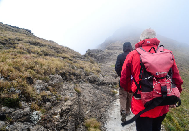 The initial walk (the trail is self-guided and well marked but if you are in the least inexperienced, best to do this with a guide) is on a good, but steep, path that skirts in a series of zig zags (pause at the top to take in the views) to the base of the Sentinel where you reach the chain ladders. These are high enough up the mountain to immediately scale the vertical face of the Mont-Aux-Sources massif.