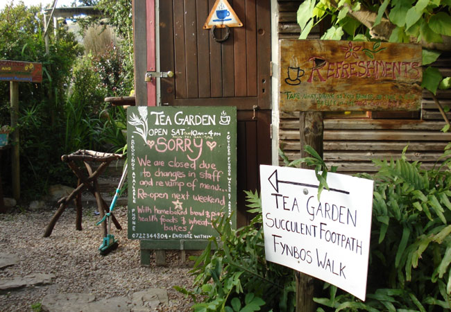 The Tea Garden at the Good Hope Nursery offers outside seating on custom made wooden furniture, amongst the fynbos flora and fauna and lulled by the trickle of the stream and the birdsong - It's a very restful and rustic scene!