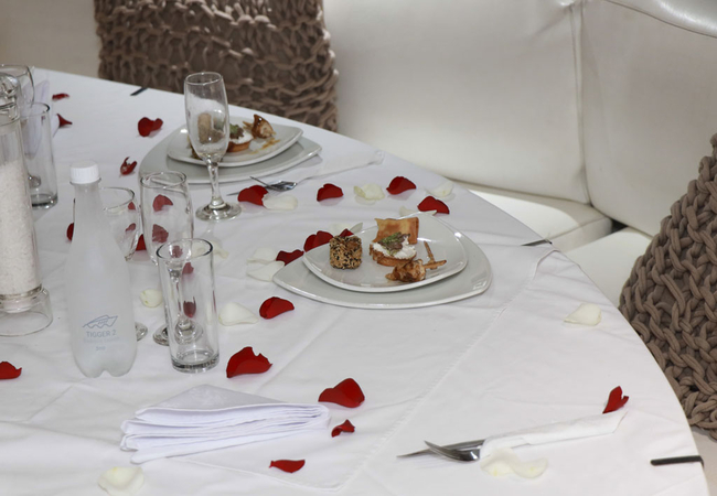 This is a Private Charter for one couple only. Departing from the V&A Waterfront in Cape Town, set off on a romantic sunset cruise and be served Bubbly with dry snacks as the sun sets. This is followed by an extensive 3 course dinner on board at a candlelit table covered in Rose Petals.
