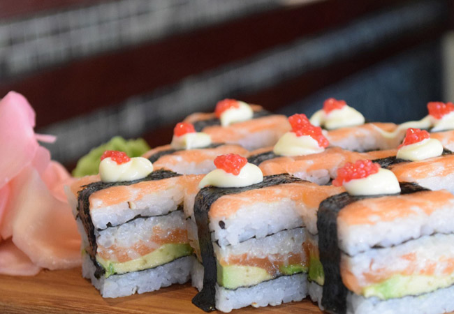 Some of the signature dishes include the Seared Salmon salad, prawns rolls with teriyaki sauce, spring onions and Japanese mayo, malay chicken noodles with fresh coriander, chilli sauce and coconut milk, salmon sandwiches rolled and wrapped in salmon, topped with caviar and mayo and the best dessert on the menu must be the wasabi truffle which is a lindt chocolate with a wasabi base and topped with crème brulee.