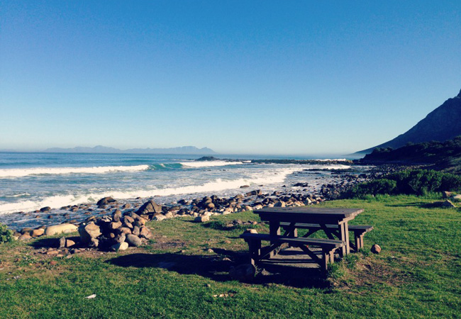 Sparks Bay Day Camp, if you can manage it out of season, is one of the most beautiful spots on the coast. The shoreline is littered with stones, the sound of the sea slapping them against one another a constant background noise, whilst the view across the bay to Rooi Els and Hangklip is one of the Cape's most famous.
