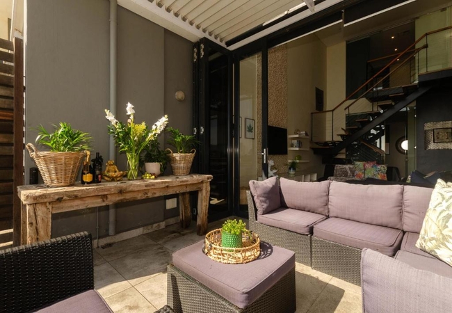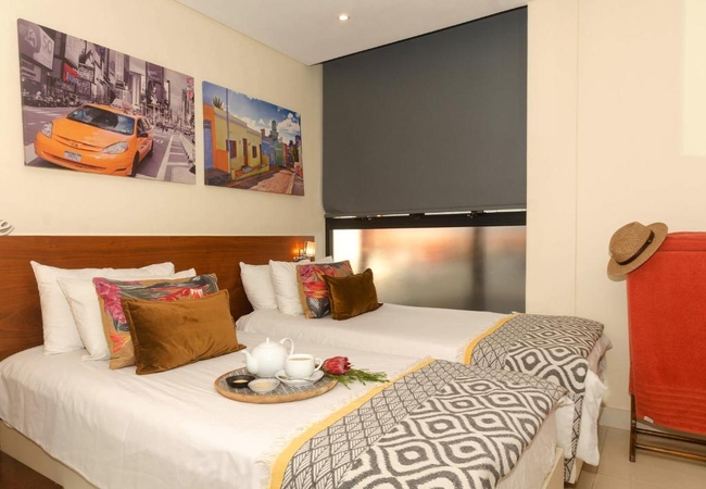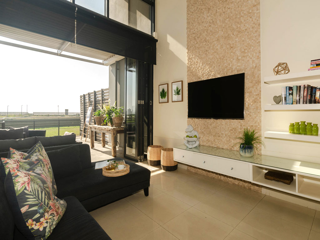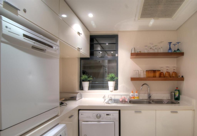 The kitchen is fully fitted with a separate scullery, housing a dishwasher, washing machine and tumble dryer. The kitchen dining area has a Caesar stone centre island surrounded by eight white leather chairs. The kitchen is equipped with a Nespresso Coffee Machine, stove, oven, microwave, kettle and toaster. The apartment has free WiFi. The entire apartment is fully tiled with ducted air-conditioning. The TV lounge is equipped with a Smart TV, Netflix, Showmax DStv on demand and board games.