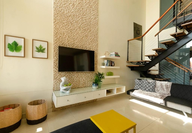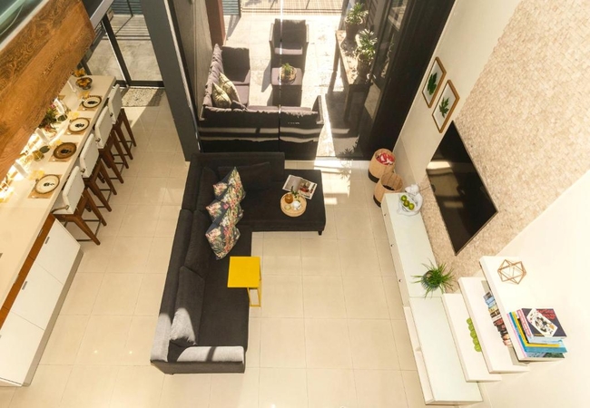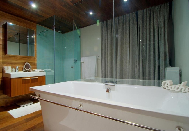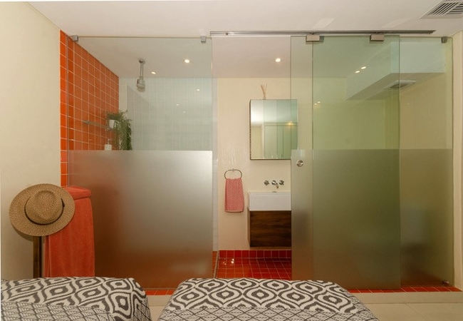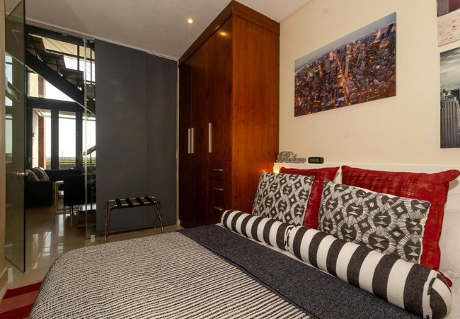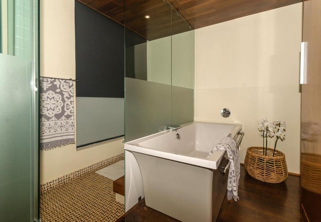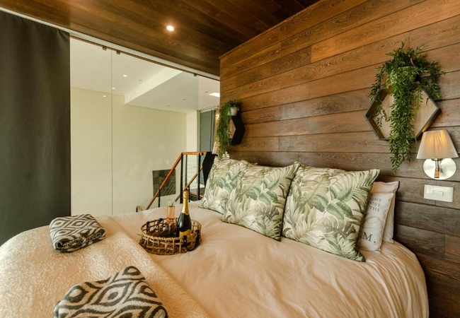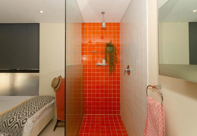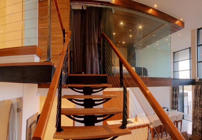 Quayside Waterfront Apartment sleeps six guests in three bedrooms. The main living areas are double volume and all three rooms have glass walls and doors facing the ocean. Each bedroom is furnished with a King-size bed and has an en suite bathroom. The main bedroom is suspended in the air with glass walls framing the view and it has a walk in shower and toilet with a separate bathtub and basin. The second and third bedrooms have an en-suite bathroom fitted with a shower, toilet and basin.