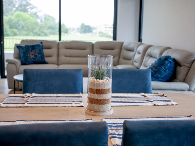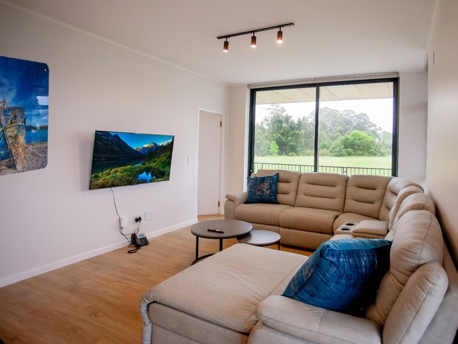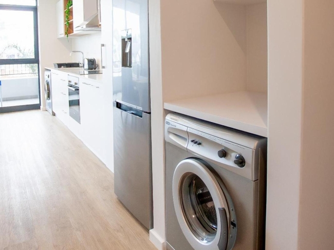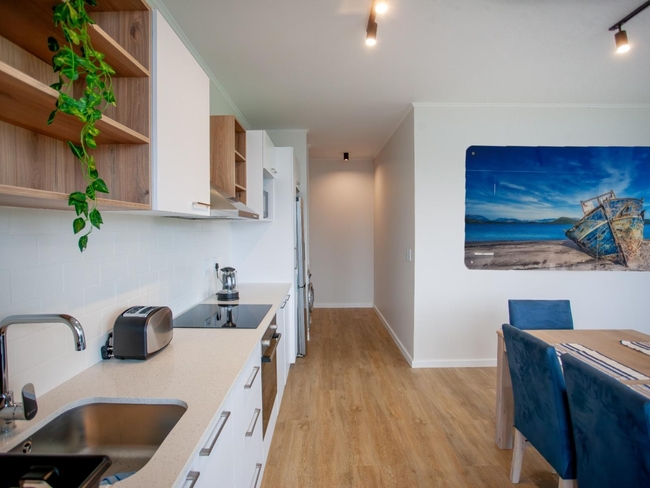 The flat features a well-equipped kitchen with a washing machine and a tumble dryer, and the adjacent open-plan living area has a large flat-screen TV with apps to stream for entertainment.