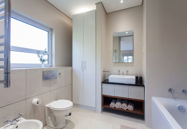 109 on Dorp is air-conditioned for comfort and each bedroom has an en-suite bathroom; one with a bath and the other with a shower. The main bedroom comprises of a King-size bed (which can be converted into twin beds upon request) and the second bedroom has twin beds. Bed linen and bathroom towels are provided.