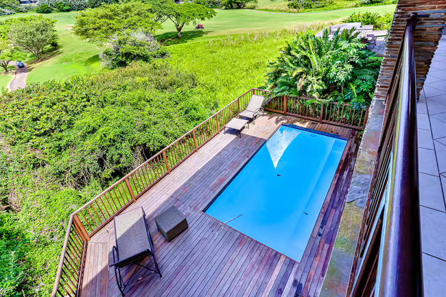 10 Uluwatu Zimbali is a luxury, four bedroomed house, all bedrooms en-suite, perched above the 6th fairway of the Zimbali Golf Course. It has a large wooden deck encompassing a delightful splash pool with champagne seat. It has both a Weber braai and a Jetmaster braai for ultimate entertaining on your deck.