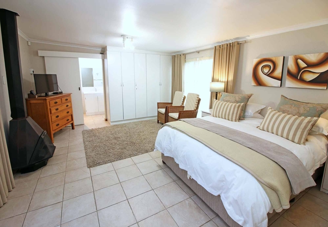 The studio apartment is furnished with a King-size bed and has a TV with DStv. The en-suite bathroom has a shower only. The kitchen is fully equipped for self catering.