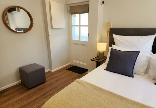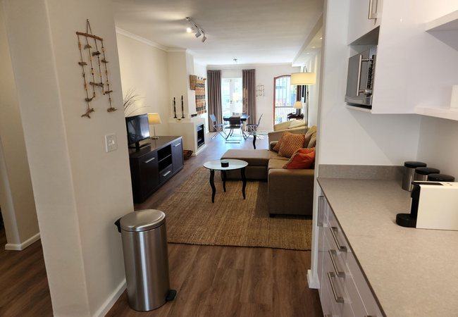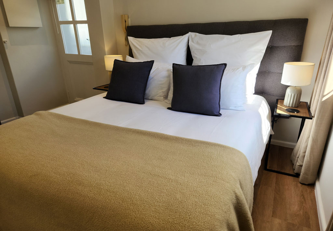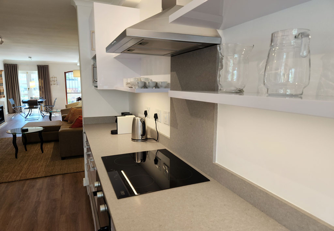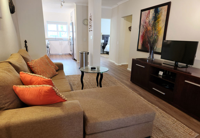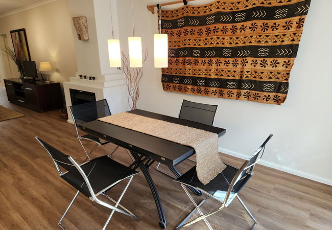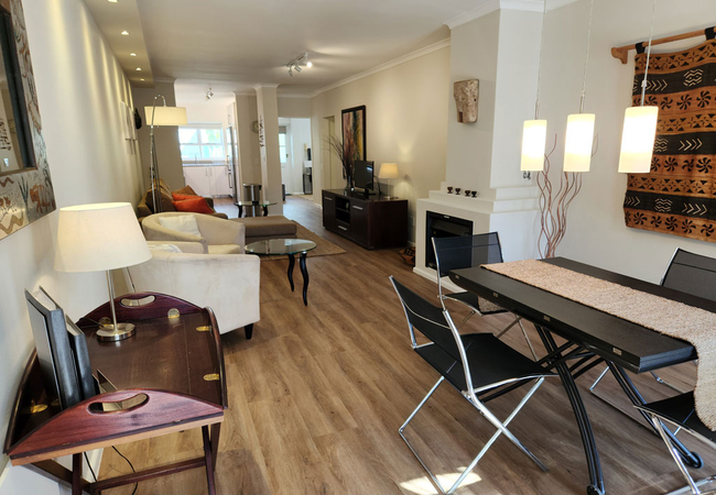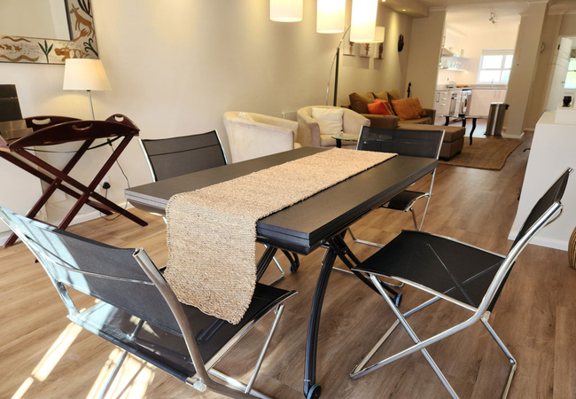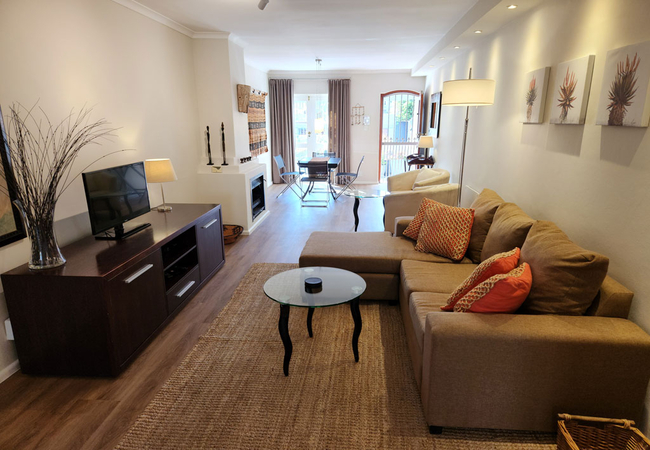 115 De Waterkant Piazza is Located at the quiet end of the village. This property has its own entrance and benefits from secure parking and access to a large communal swimming pool. The front entrance is dominated by a large outdoor terrace with sun-lounges and seating. All on one level, the open plan living room has been tastefully furnished and spans from the dining area, living space to the kitchen. The master air-conditioned bedroom has French windows opening onto the front terrace. Both bedrooms have separate bathrooms one with shower and one with bath. The rear air-conditioned bedroom has direct access to the communal swimming pool, garden and secure parking area which you drive into from De Smidt Street. The garage opening is 5.19m wide and 2.28m high. This holiday cottage does have Wi-Fi available on request. The cottage is cleaned six days a week with a light service on Sundays, with the exception of public holidays. We provide all bed linen and towels and the kitchen is fully fitted and there is complimentary tea and coffee to get you started. The property has WiFi, satellite television, DVD, music systems, and a manual wall safe. 2 bedrooms and 2 bathrooms; Air-conditioned bedrooms; Terrace with village views; Communal pool; Secure parking.