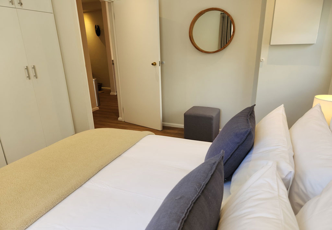 The rear air-conditioned bedroom has direct access to the communal swimming pool, garden and secure parking area which you drive into from De Smidt Street. The garage opening is 5.19m wide & 2.28m high.