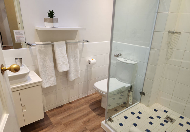 The master air-conditioned bedroom has French windows opening onto the front terrace. Both bedrooms have separate bathrooms one with shower and one with bath.
