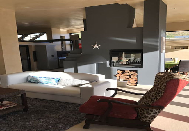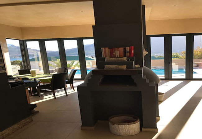 The house has a comfortable living area with a fireplace, a pizza oven, a patio area with a swimming pool and an outdoor braai area.