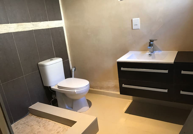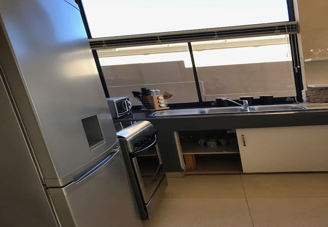There is a fully equipped kitchen with a gas stove, oven, fridge, kettle, crockery and cutlery. There is also a laundry room for convenience.