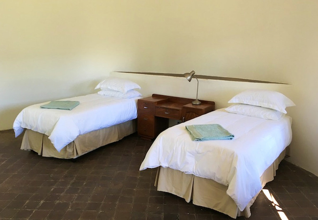 The Apartment has an open plan kitchen and living area with a private terraced courtyard. Two bedrooms one furnished with a double bed and the other with twin beds. There are two bathrooms fitted with a shower, toilet and basin. The units have braai facilities as well as your own grazing garden to use during your stay. This stay includes breakfast.