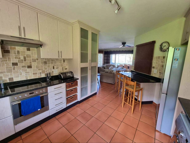 The kitchen is fully equipped with a fridge-freezer, stove, oven, cutlery, crockery, washing machine, and a breakfast bar with stools. The living room boasts comfortable couches, ceiling fans, air conditioning, and a TV. It opens onto an enclosed patio with a dining table and a gas braai. Free Wi-Fi is available throughout the unit.