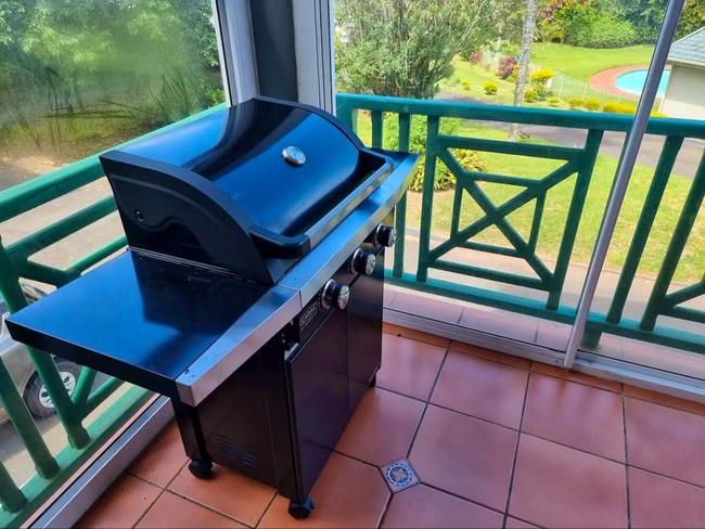 Guests can enjoy a communal swimming pool and secure parking. The property is conveniently located near shops, restaurants, and the beach.