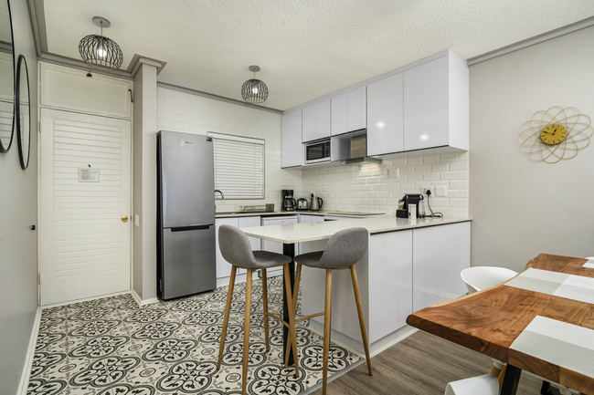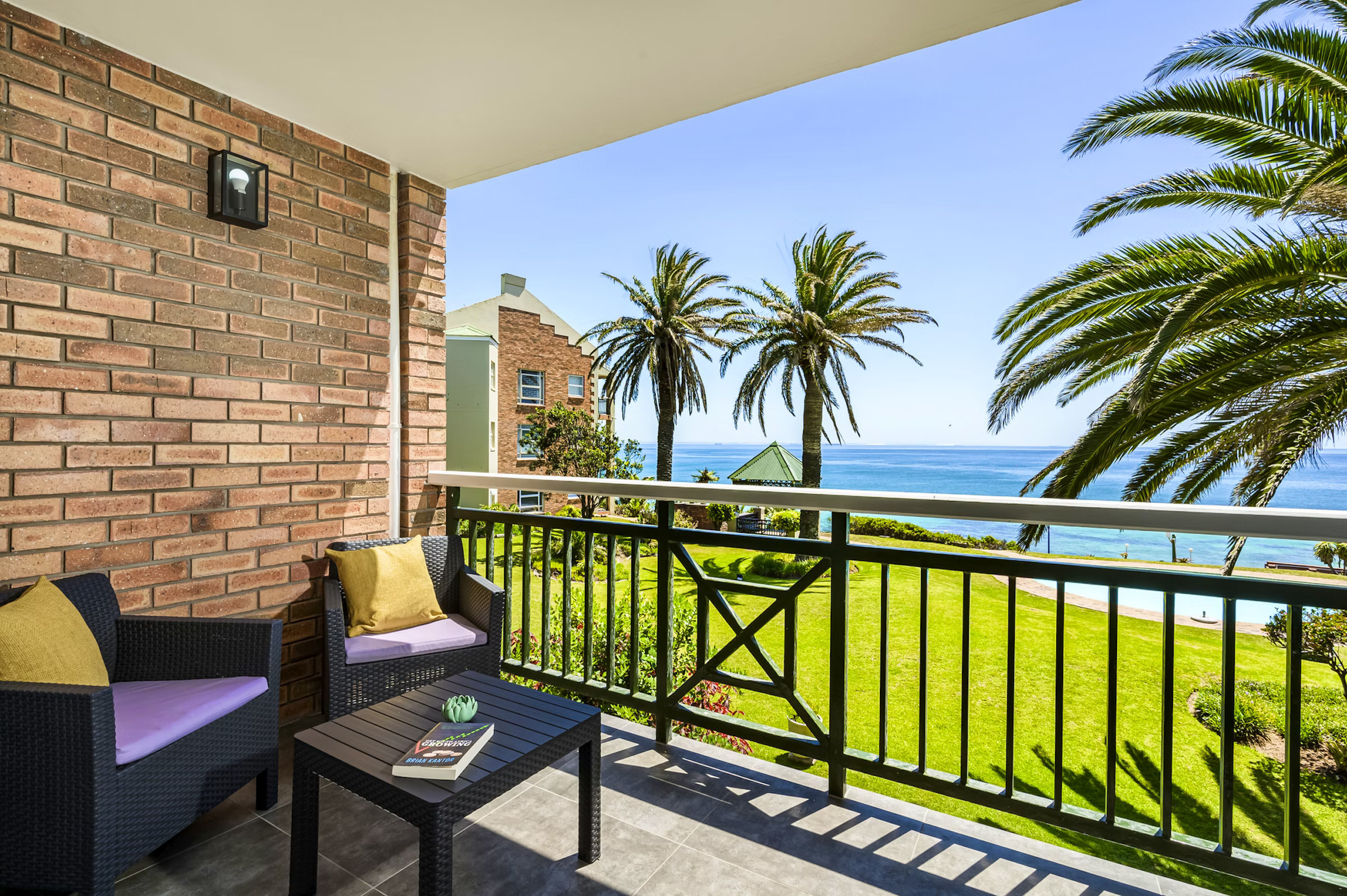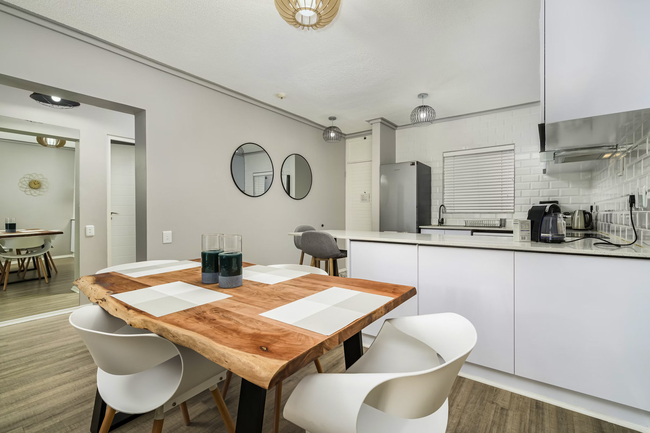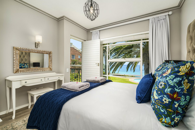 This stylish two-bedroom apartment offers unparalleled ocean and pool views. The spacious, open-plan kitchen, dining, and living areas are designed to maximize comfort and functionality, seamlessly opening onto a balcony with outdoor seating through stacker doors. The apartment comprises two en-suite bedrooms, a kitchen, and a lounge. The main bedroom, which opens onto the balcony, is furnished with a double bed and features an en-suite bathroom with a bath and toilet. The second bedroom has two single beds and an en-suite bathroom with a shower and toilet. Linen and towels are thoughtfully provided for your convenience. The fully equipped kitchen includes a stove and oven, microwave, refrigerator, and tea-and-coffee-making facilities. Guests can enjoy meals at the breakfast bar or the dining table. In the lounge, you'll find a TV with selected DStv channels, Netflix, and Wi-Fi access. The lounge opens onto a balcony, offering views of the swimming pool and the ocean. Guests can relax by the communal swimming pool, make use of the communal braai area, or take a short 400-meter stroll to the beach.