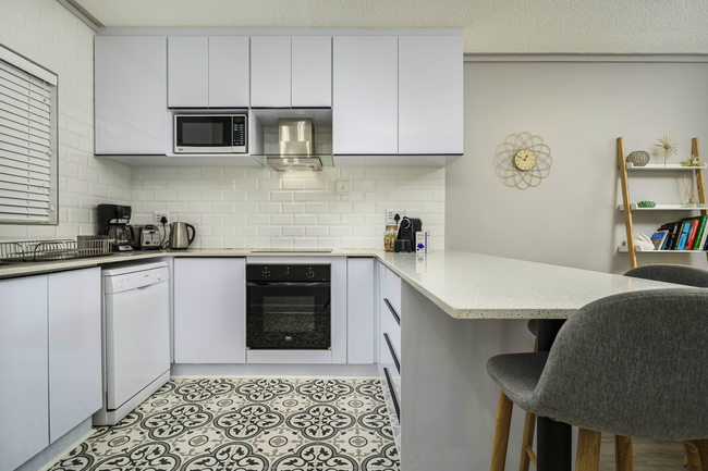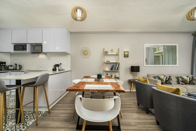 The fully equipped kitchen includes a stove and oven, microwave, refrigerator, and tea-and-coffee-making facilities. Guests can enjoy meals at the breakfast bar or the dining table.
