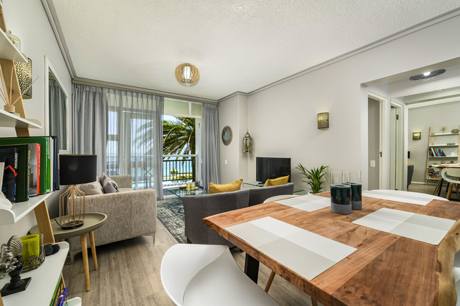 This stylish two-bedroom apartment offers unparalleled ocean and pool views. The spacious, open-plan kitchen, dining, and living areas are designed to maximize comfort and functionality, seamlessly opening onto a balcony with outdoor seating through stacker doors.