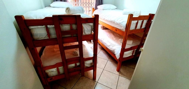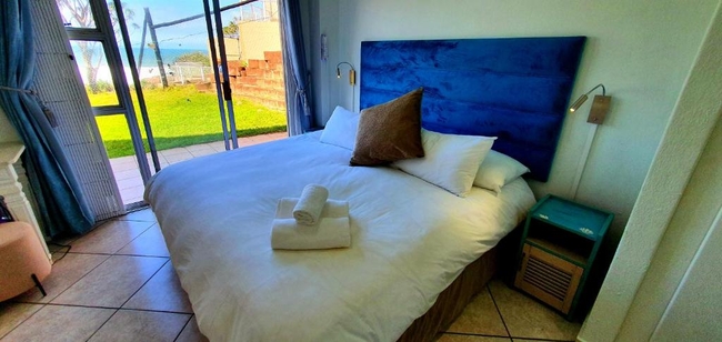 This unit accommodates up to six adults and two children, offering three bedrooms and two bathrooms. The main bedroom features a king-size bed and an en-suite bathroom with a bath. The second bedroom contains a double bed, while the third bedroom is fitted with two bunk beds suitable for two adults and two children. These two bedrooms share a second bathroom equipped with a shower. All linen and bath towels are provided, although guests should bring their own beach towels. The open-plan living area includes a fully equipped kitchen with a stove, oven, microwave, fridge-freezer, cutlery, crockery, and a breakfast bar with stools. A washing machine is also available for guest use. Leading from the kitchen, the lounge offers comfortable seating and a television with a full selection of DStv channels, as well as free uncapped Wi-Fi. Sliding doors from both the main bedroom and the lounge open onto a patio with views of the ocean. The patio is furnished with a six-seater dining table and features a built-in braai, providing a perfect setting for outdoor dining and relaxation. The complex provides a coin-operated laundry, a communal swimming pool, tennis courts, a children’s play area, and a shared braai area. Secure parking is available within the complex, along with additional visitor parking for guests.