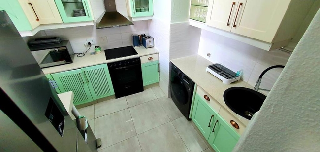 The open-plan living area includes a fully equipped kitchen with a stove, oven, microwave, fridge-freezer, cutlery, crockery, and a breakfast bar with stools. A washing machine is also available for guest use. Leading from the kitchen, the lounge offers comfortable seating and a television with a full selection of DStv channels, as well as free uncapped Wi-Fi.