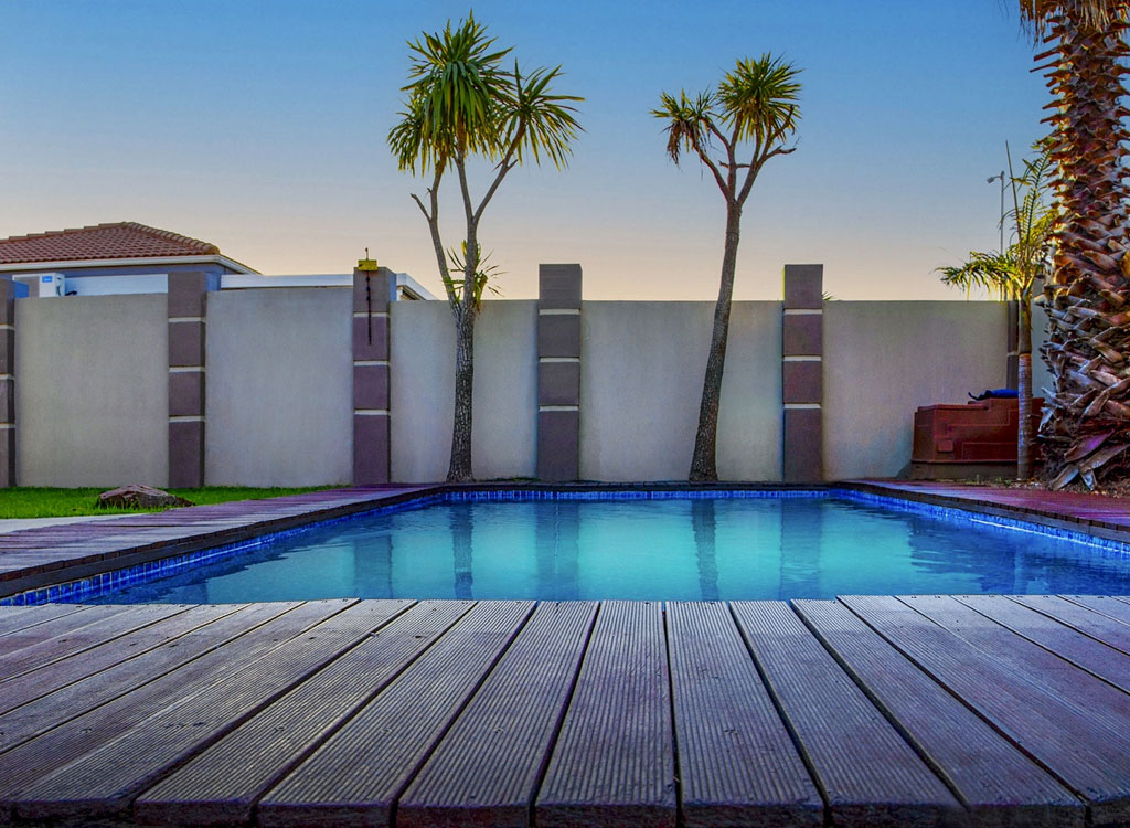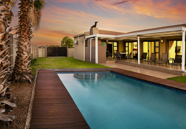 The well-equipped kitchen contains a fridge, a microwave, an oven with a stove, and a breakfast bar with seating. The open-plan living area offers sofas to relax on, and leads out to the backyard, which boasts a built-in braai area and a covered swimming pool. Secure garage parking is available on the property.