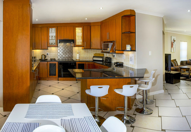 13 Alterreal is a furnished home in Parsonsvlei that can accommodate 6 guests. The main bedroom is furnished with a queen-size bed and features an en-suite bathroom fitted with a shower, toilet and basin. The second bedroom is furnished with Twin beds, and the third bedroom is furnished twin beds. The second and third bathrooms are fitted with a shower, a basin, and a toilet. The well-equipped kitchen contains a fridge, a microwave, an oven with a stove, and a breakfast bar with seating. The open-plan living area offers sofas to relax on, and leads out to the backyard, which boasts a built-in braai area and a covered swimming pool. Secure garage parking is available on the property. The accommodation is not affected by loadshedding as there are inverters and a gas stove. The lights and Wi-Fi can be used during loadshedding.