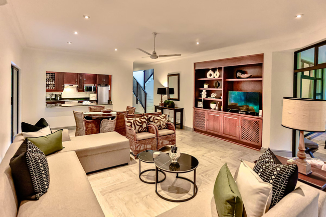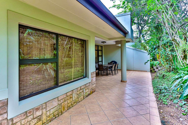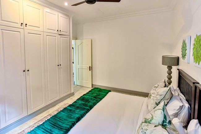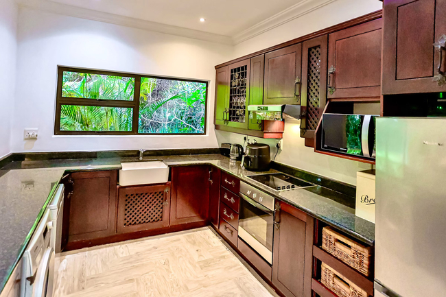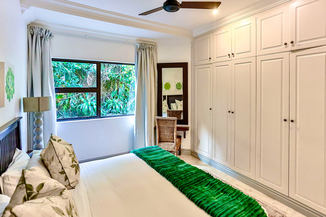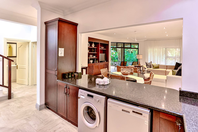 Designed to accommodate up to six guests, 14 Sawubona features three well-appointed bedrooms and two bathrooms. The main bedroom is furnished with a king-size bed and boasts a private en-suite bathroom fitted with both a bathtub and a shower. The second bedroom includes a queen-size bed, while the third offers two single beds. These two rooms share a separate bathroom with a shower. All bedding and bath towels are provided for guest comfort. The kitchen is fully equipped with all the essentials, including a stove, oven, microwave, kettle, fridge-freezer, dishwasher, and washing machine. The open-plan lounge and dining area is air-conditioned and tastefully furnished, creating a welcoming space for both relaxation and shared meals. Entertainment includes a television with DStv channels and complimentary Wi-Fi. The interior flows out to a covered patio, complete with comfortable outdoor seating and a portable braai, overlooking a private garden, a tranquil setting for unwinding at the end of the day. Guests also enjoy access to a communal swimming pool within the Zimbali estate. Secure parking is provided. Guests can also take advantage of Zimbali’s exceptional amenities, including the championship golf course, tennis and squash courts, and direct access to the beach, all within close reach.