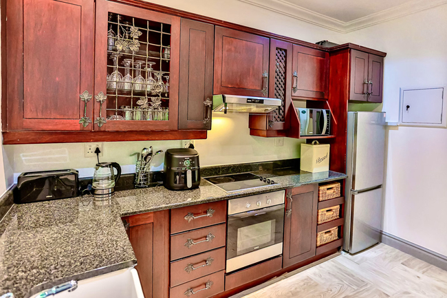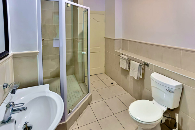 The kitchen is fully equipped with all the essentials, including a stove, oven, microwave, kettle, fridge-freezer, dishwasher, and washing machine. The open-plan lounge and dining area is air-conditioned and tastefully furnished, creating a welcoming space for both relaxation and shared meals. Entertainment includes a television with DStv channels and complimentary Wi-Fi.