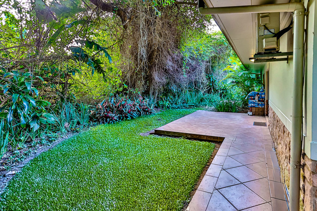 The interior flows out to a covered patio, complete with comfortable outdoor seating and a portable braai, overlooking a private garden, a tranquil setting for unwinding at the end of the day. Guests also enjoy access to a communal swimming pool within the Zimbali estate.