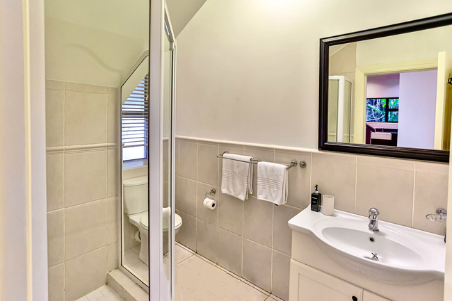The main bedroom is furnished with a king-size bed and boasts a private en-suite bathroom fitted with both a bathtub and a shower. The second bedroom includes a queen-size bed, while the third offers two single beds. These two rooms share a separate bathroom with a shower. All bedding and bath towels are provided for guest comfort.