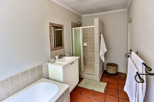 adjoins an alcove equipped with two single beds, perfect for young children. The second and third bedrooms each feature two single beds, while the fourth bedroom offers two single beds suitable for children. The house has three bathrooms, including two en-suite bathrooms with showers, and one additional bathroom with both a bath and shower. Guests can also make use of the convenient outdoor shower. Designed for relaxation, the open-plan lounge and dining area offer ample seating and entertainment, with a Smart TV available for guests to log in to their own DStv or Netflix accounts. The kitchen is fully equipped with modern appliances, including a stove, oven, air fryer, microwave, and dishwasher, catering to all your self-catering needs. While Wi-Fi is available, please note there is limited mobile reception in the area.