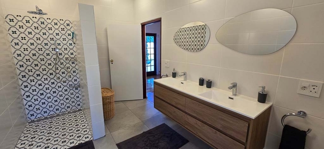 The cottage offers two bedrooms, each designed as a restful retreat with air conditioning, double beds fitted with extra-length mattresses, and generous cupboard space for comfortable longer stays. Two stylishly renovated bathrooms provide both bath and shower facilities with modern fittings for added convenience and comfort.