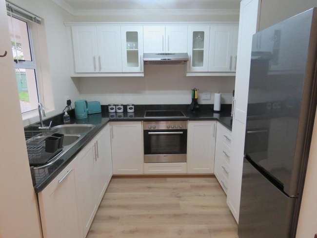 The kitchen is fully equipped with a fridge-freezer, microwave, oven with a gas hob, coffee machine, kettle, and toaster, making meal preparation convenient and enjoyable. The adjacent lounge provides a cozy retreat with reclining sofas and a smart TV offering Netflix for entertainment. Outside, the patio includes a braai area and an outdoor dining space, ideal for al fresco meals. Fibre Internet ensures seamless connectivity, and secure parking is available for added peace of mind.